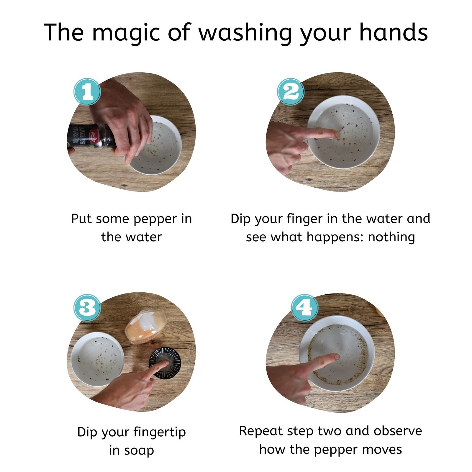 You can ask them to imagine the ground pepper as the organisms of the virus spreading on their hands if they don't wash them regularly. However, soap is their best friend and helper! Show them how the ground pepper moves away from their finger as soon as they put some soap on it. That's exactly how the virus disappears from their hands when they wash them correctly.