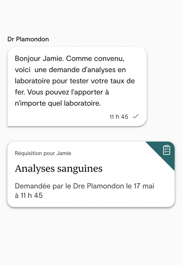 Veuillez prendre note que Maple ne doit pas être utilisé pour les demandes d’analyses de laboratoire ou d’imagerie diagnostique d'urgence. Si vous avez besoin de résultats immédiats, veuillez obtenir des soins en personne.