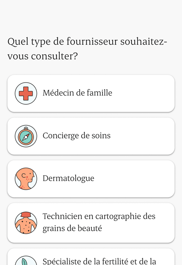 Ouvrez votre profil Maple et cliquez sur « Obtenir des soins ». Vous serez invité à sélectionner un médecin généraliste ou un médecin spécialiste. Selon votre choix, vous serez redirigé vers un bref formulaire de prise en charge dans lequel vous devrez, notamment, préciser le médecin spécialiste que vous aimeriez consulter et décrire vos symptômes.