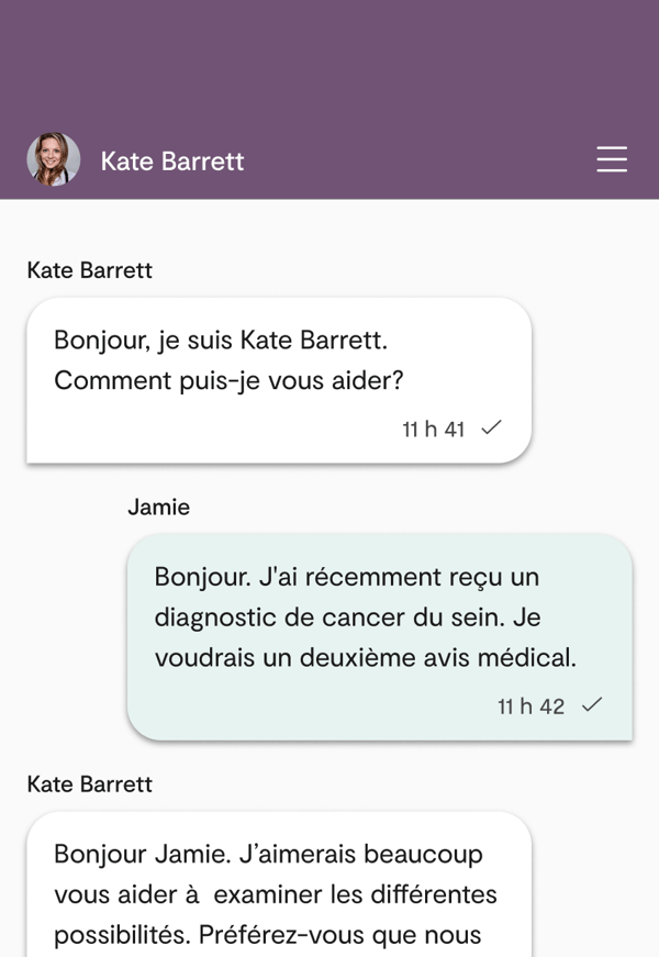 Nos intervenants-pivot peuvent répondre à vos questions et discuter avec vous des traitements ou des essais cliniques possibles. Communiquez avec nous en ligne par messages textes, appel audio ou visioconférence à partir de votre téléphone, de votre tablette ou de votre ordinateur.
