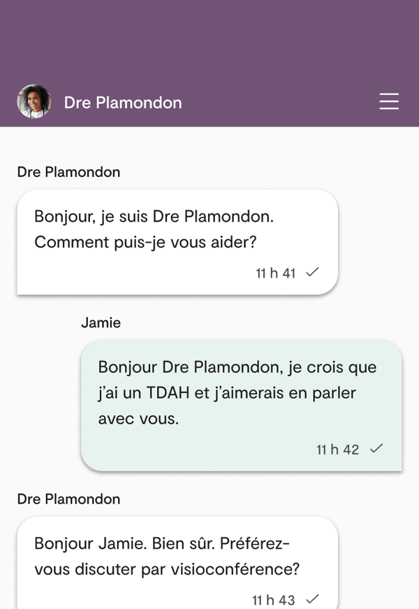 Connectez-vous à votre compte Maple à l’heure prévue de votre rendez-vous. L’évaluation et la présentation du diagnostic ainsi que des options de traitement seront menées par visioconférence. Ces consultations s’étalent généralement sur trois séances.