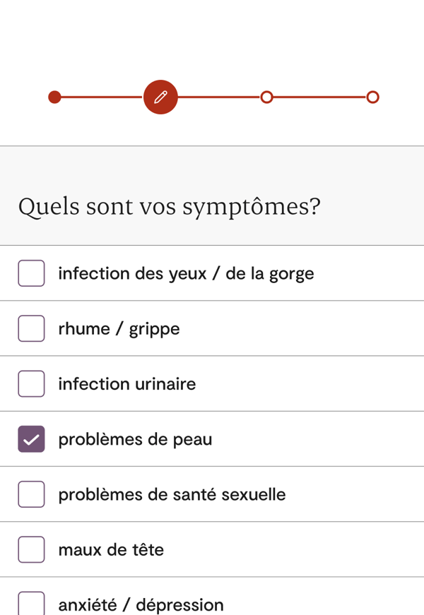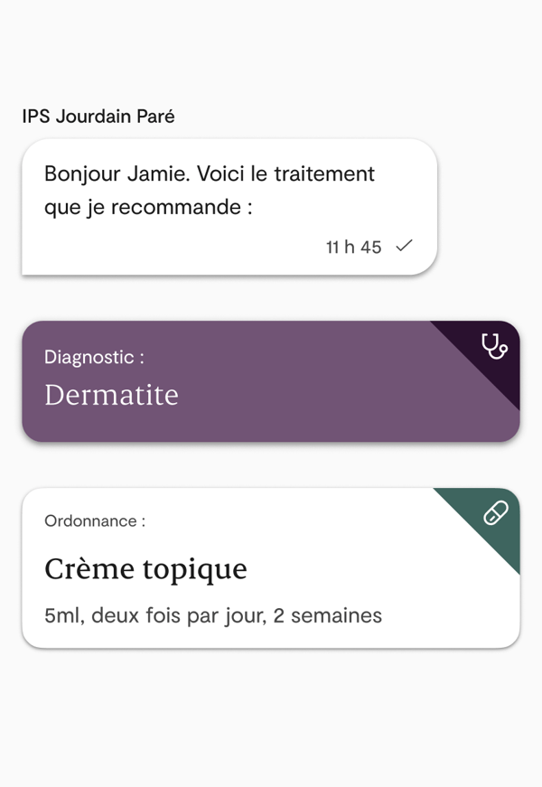 Les consultations fonctionnent de manière similaire aux rendez-vous en personne — le médecin peut effectuer une évaluation en posant des questions sur vos symptômes, en examinant vos antécédents médicaux et en déterminant le traitement qui vous convient. S’il estime que votre état est plus grave, il pourrait vous recommander de vous rendre en clinique pour un examen en personne.