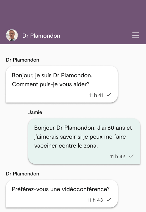 Une fois votre requête examinée, le médecin détermine s’il peut vous aider à partir de Maple. Si c’est le cas, votre consultation débutera immédiatement et vous pourrez communiquer avec le médecin par clavardage ou par appel audio ou vidéo.